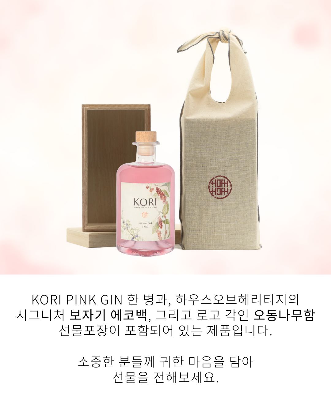 코리 핑크진 한병에 하우스 오브 헤리티지 시그니처 보자기 에코백과 로고 각인 오동나무 함이 포함되어 있는 상품입니다. 귀한 분을 위한 선물로 구매해보세요.